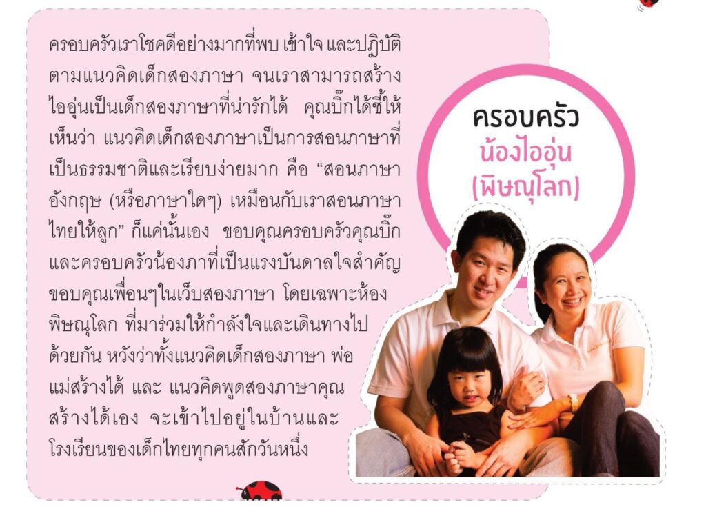 ความมุ่งมั่นของแม่เน สร้างความประทับใจให้กับผมมาก จนถือว่าเป็นหนึ่งในครอบครัวที่มีความมุ่งมั่นในการเด็กสองภาษาอย่างจริงจัง ครอบครัวหนึ่งที่ผมเคยเจอมา