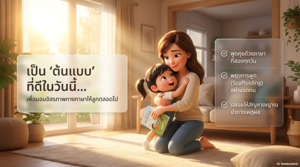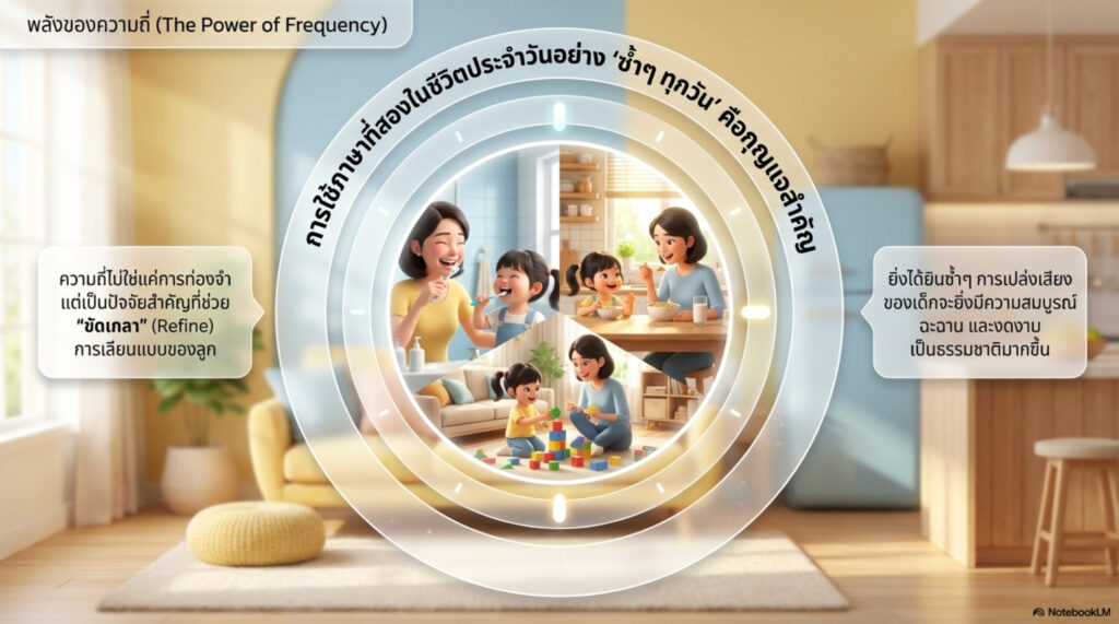 เมื่อคุณเข้าใจประเด็นนี้แล้ว ต้นแบบอย่างพ่อแม่ในการสอนภาษาที่สองจะต้องใช้ภาษาที่สองกับลูกในชีวิตประจำวัน พูดซ้ำๆทุกวัน เพราะความถี่เป็นปัจจัยสำคัญที่จะช่วยขัดเกลาการเลียนแบบของลูกให้มีความสมบูรณ์ งดงาม และบนเส้นทางก่อนที่จะไปถึงตรงนั้น พ่อแม่จะต้องทำหน้าที่ “พยุงการพูด” ตลอด และนี่คือหลักข้อที่สองของแนวคิดเด็กสองภาษา พ่อแม่สร้างได้ ที่พ่อแม่จะต้องทำอย่างต่อเนื่องไปจนโต