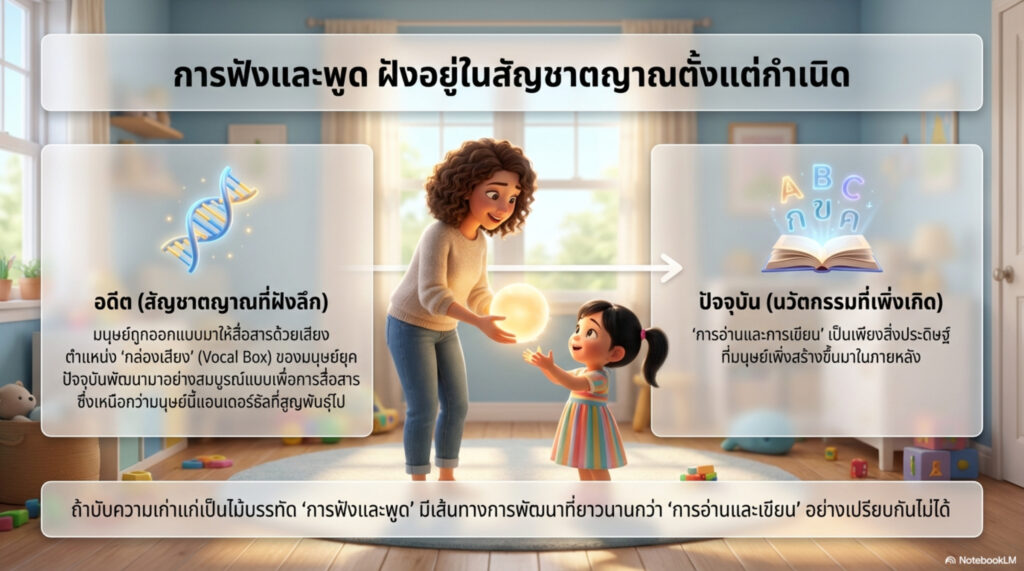 ถ้านับความเก่าแก่เป็นไม้บรรทัดวัด “การฟังและพูด” ย่อมมีเส้นทางการพัฒนาที่ยาวนานกว่า “การอ่านและเขียน” อย่างเปรียบกันไม่ได้ เมื่อเด็กลืมตาดูโลก เด็กจะส่งเสียงร้องไม่เป็นภาษาตั้งแต่เกิด เด็กใช้เวลาปีเศษในการฟังเสียงของพ่อแม่ เพื่อเริ่มฟอร์มรูปแบบเสียงแล้วเปล่งเสียงออกมา นั่นคือความพยายามในการ “เลียนแบบ” ของมนุษย์