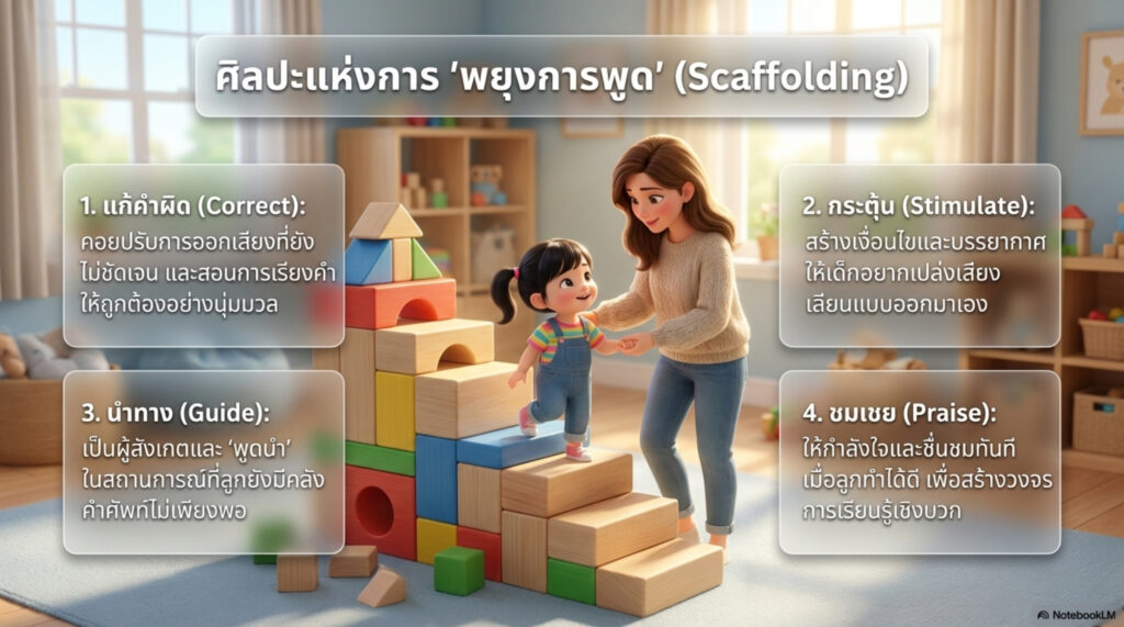 ความหมายของการพยุงการพูด ก็เริ่มตั้งแต่คอยแก้การออกเสียงที่ยังไม่ชัดเจนให้ การเรียงคำที่ถูกต้อง การกระตุ้น สร้างเงื่อนไขให้เด็กเปล่งเสียงเลียนแบบออกมา เพื่อ “จัดระเบียบร่างกายในการพูด” ให้เด็กคุ้นเคย ซักซ้อมในการบังคับกล้ามเนื้อ ลิ้น ขากรรไกร เส้นเสียง และส่วนต่างๆในการพูด เพื่อให้สิ่งนี้หลอมรวมเป็นส่วนหนึ่งของความรู้สึก